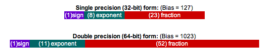 可见,在存储格式上,规范采用了 [符号位 sign] [指数位 exponent] [小数位 fraction] 三部分来表示,其中 - single float 包括 { 1bit sign | 8bit exponent | 23bit fraction } - double float 包括 { 1bit sign | 11bit exponent | 52bit fraction }