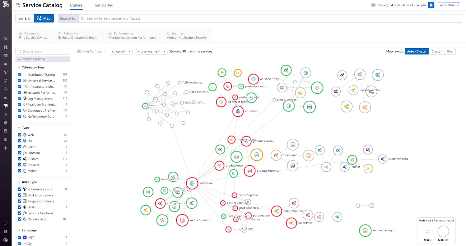 现代环境由许多动态层、微服务、无服务器应用和网络技术组成,因此在你的可观测性组合中加入最新的拓扑结构,对于区分因果关系至关重要。拓扑结构为数以千计的未连接的数据流提供了锚点,使它们具有结构性,使以前看不见的连接变得可见。拓扑可视化让你在全栈活动的背景下查看来自网络、基础设施、应用程序和其他领域的遥测数据;它还为你提供了重要的背景,让你知道当某些事情发生时,你的业务是如何受到影响的。