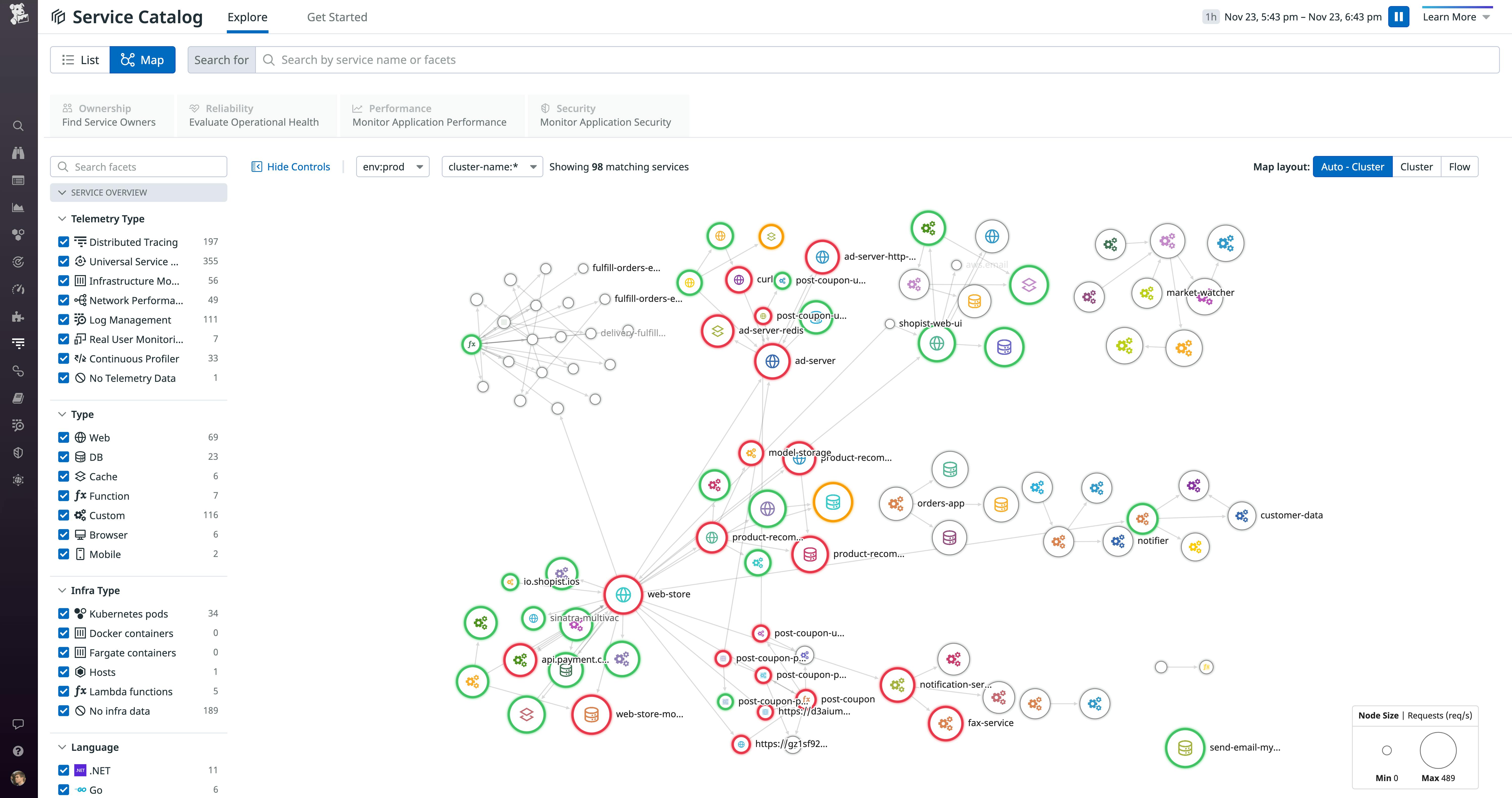 - Smartscape:应用程序及其基础设施之间的依赖、关联映射关系的可视化,类似 Datadog 的 Service Catalog